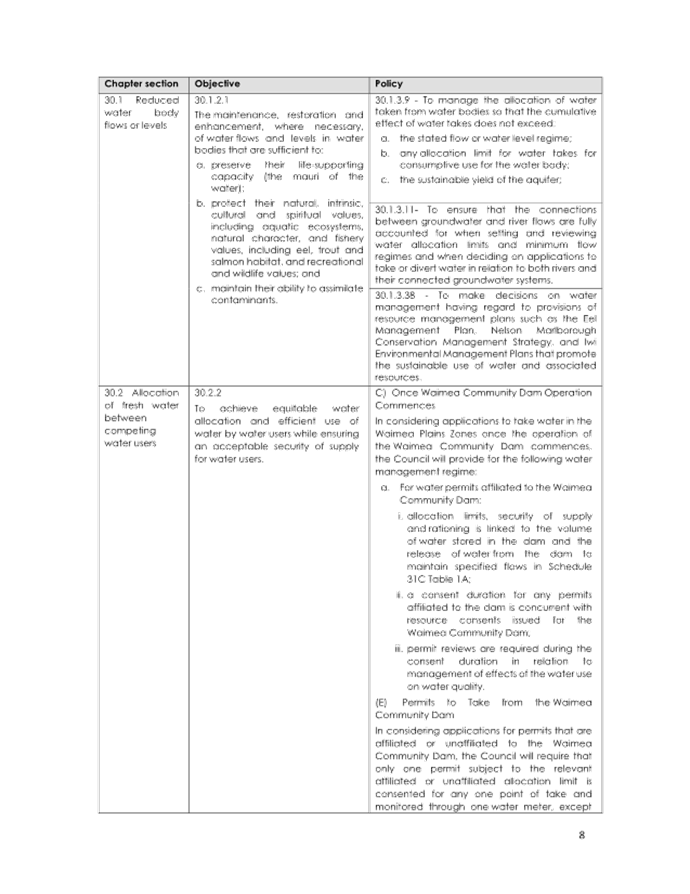 The allocation regimes for the Appleby Gravel Zone and the Wai-iti Dam Service Zone protect water for its ecological values and contributions to river flows. It maintains a reservation for community drinking water. The remaining water is then available for irrigation and consumptive use. Therefore, the obligations of Te Mana o Te Wai are met. |