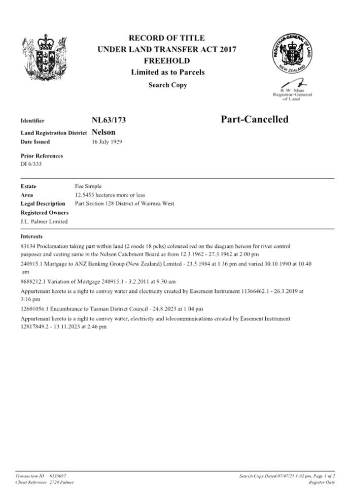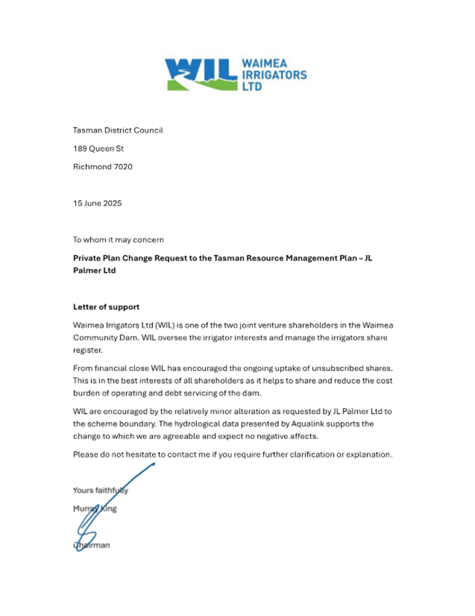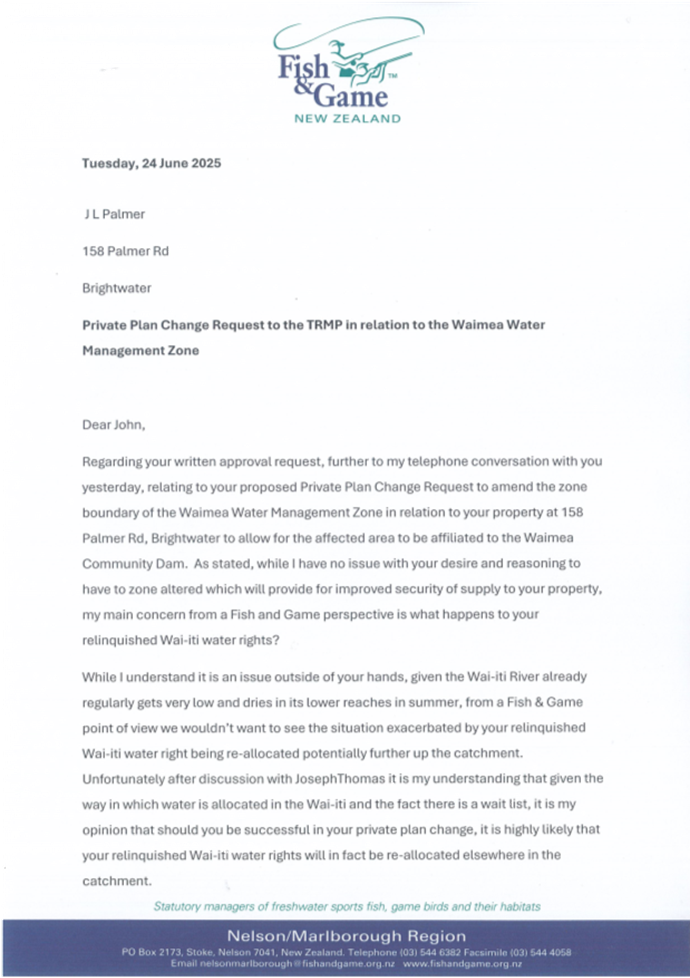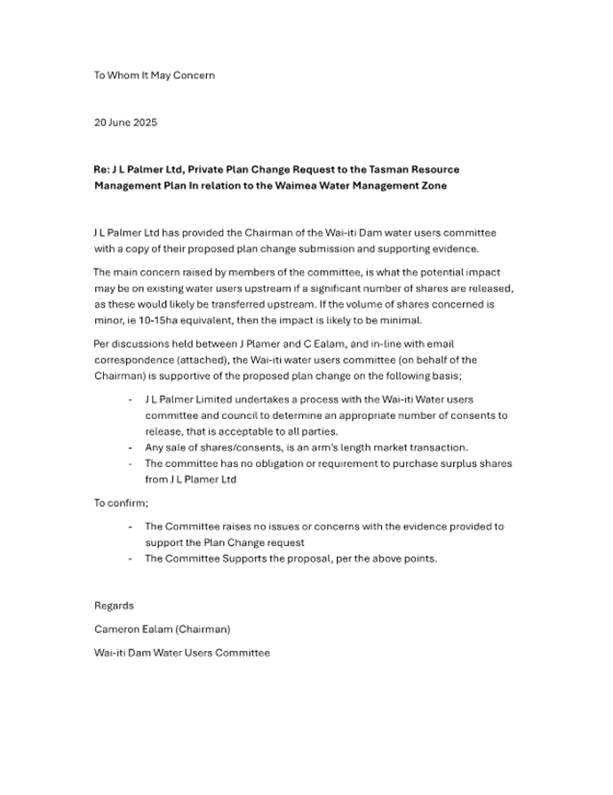 12.4 There is a waiting list for water permits in the Wai-iti Dam Service Zone and if JL Palmer Ltd can utilise water from the Waimea Dam, another user up-catchment may benefit from the Wai-iti Dam shares he will no longer require.