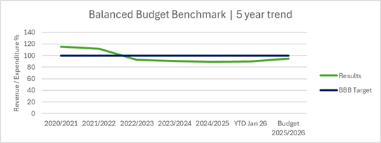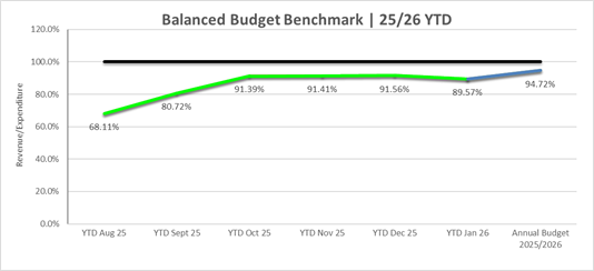 1.5.5 The balanced budget benchmark was 89.6% as at 31 January 2026, compared with a budgeted position of 94.72%.