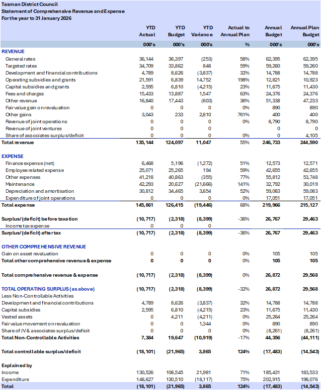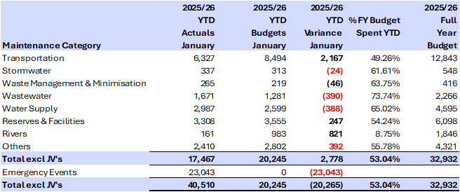 1.5.1 Severe weather events continue to have a material impact on the Council’s financial position. As at 31 January 2026, operating expenditure related to these events totalled $25.3 million, of which $23.0 million has been classified as maintenance. This excludes staff time. A separate report is being prepared for the Information‑Only Council meeting on 28 April 2026, which will provide an update on the emergency events, including financial and insurance matters.