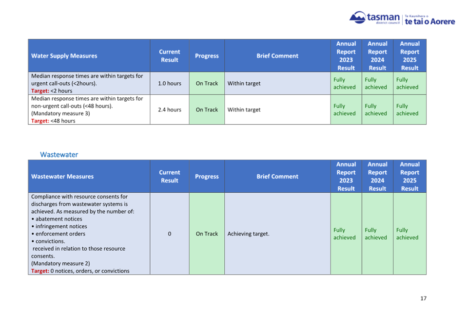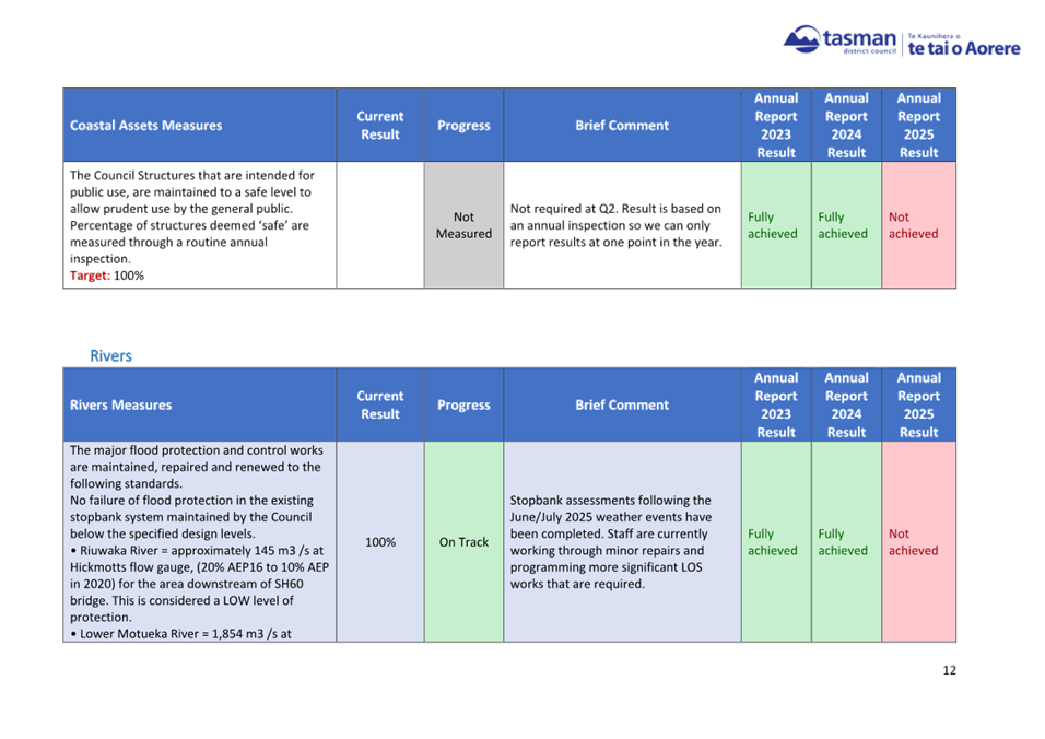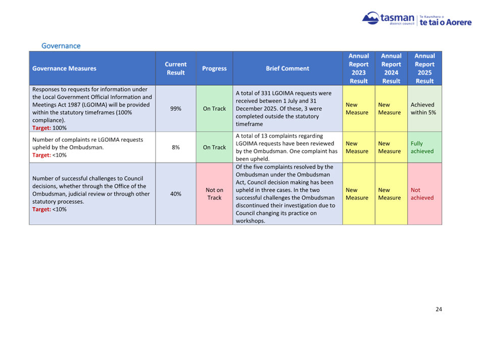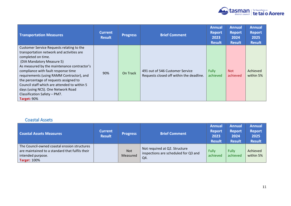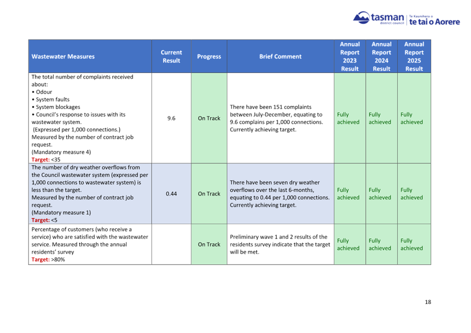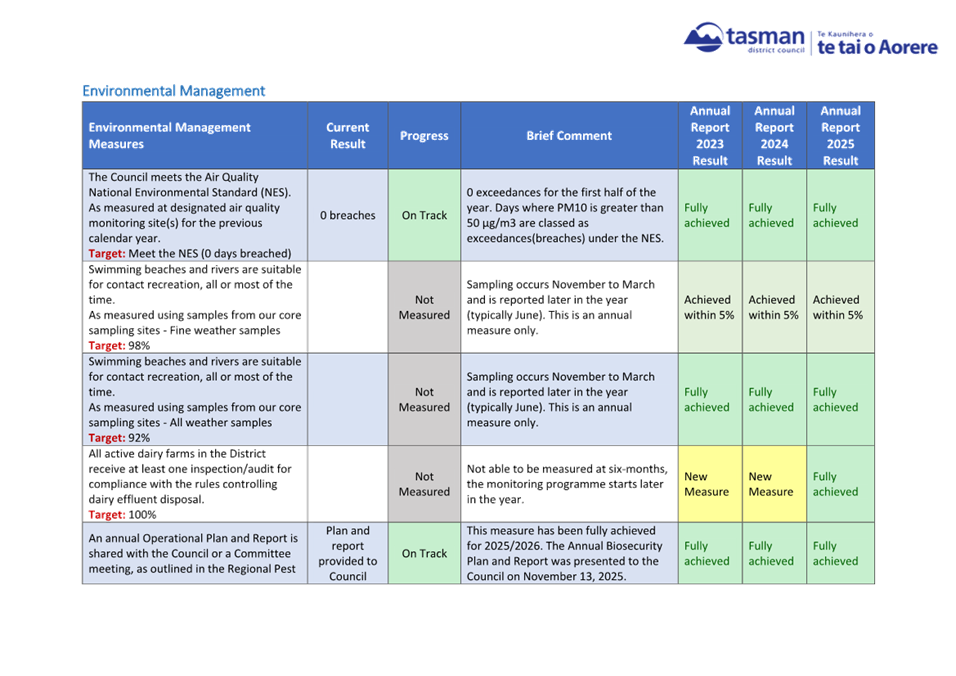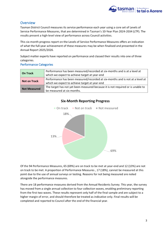1.1 This report summarises the six-month progress (July to December 2025) against the Levels of Service Performance Measures set in Tasman’s 10-Year Plan 2024-2034 (LTP). The Council measures its service performance each year using a core set of indicators set in the LTP.