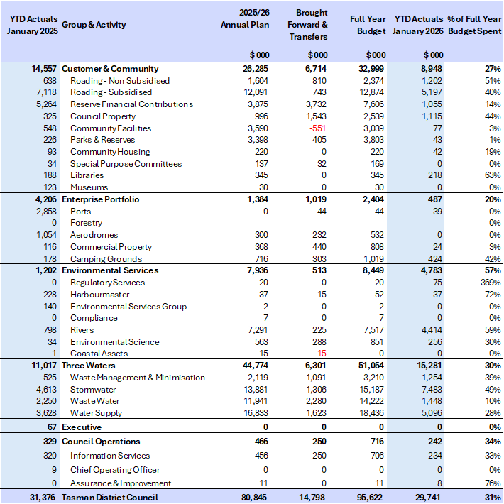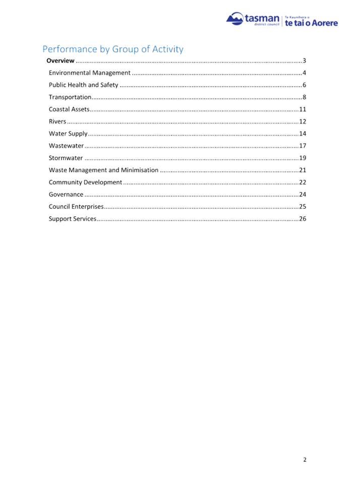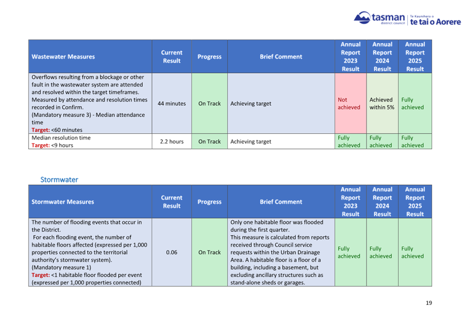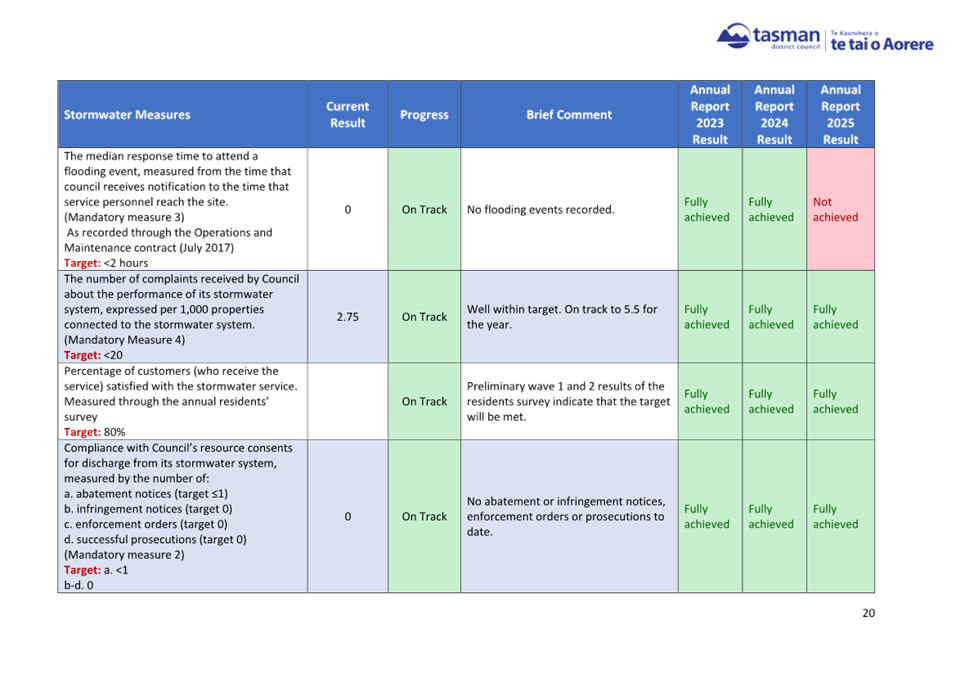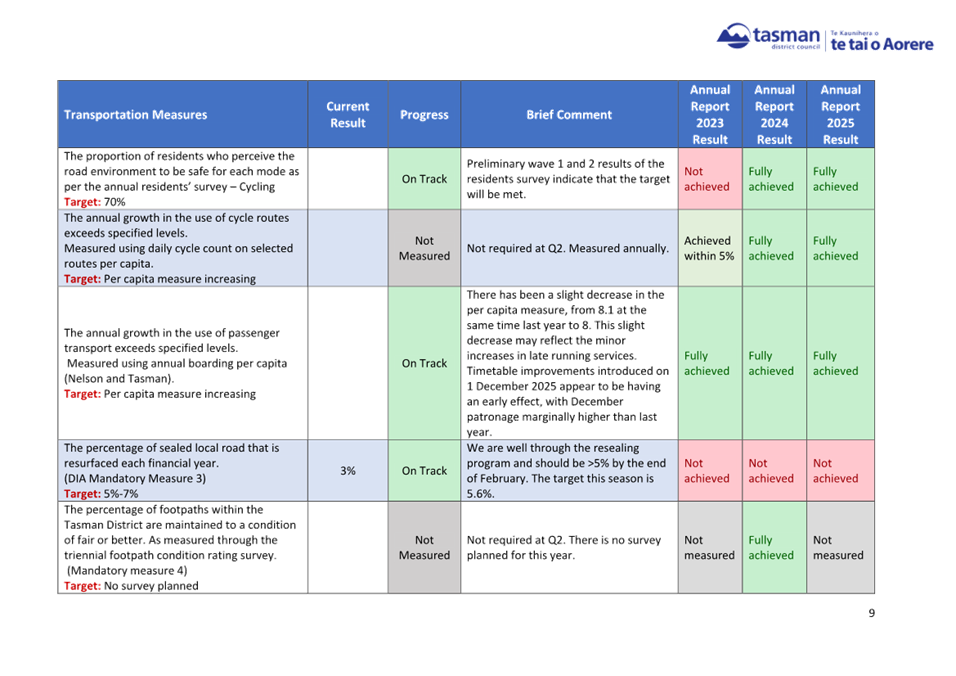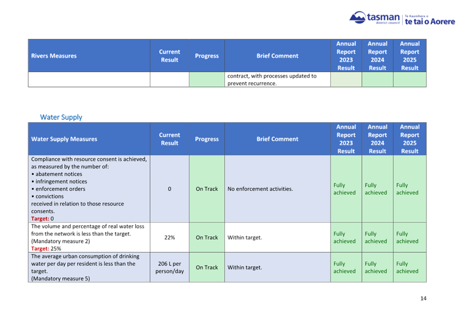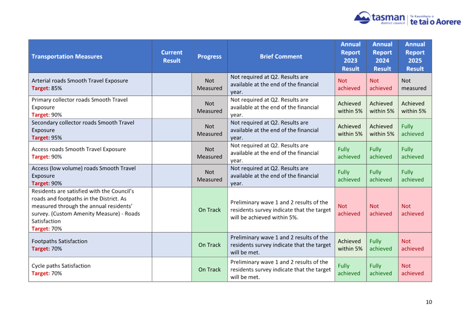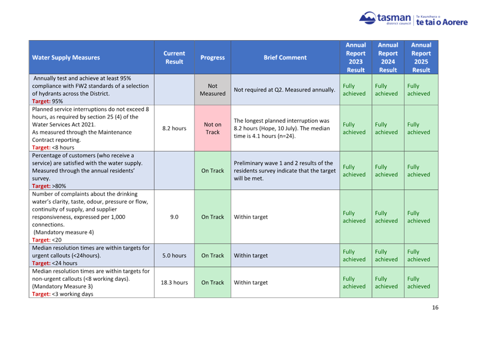 1.1 This report summarises the six-month progress (July to December 2025) against the Levels of Service Performance Measures set in Tasman’s 10-Year Plan 2024-2034 (LTP). The Council measures its service performance each year using a core set of indicators set in the LTP.