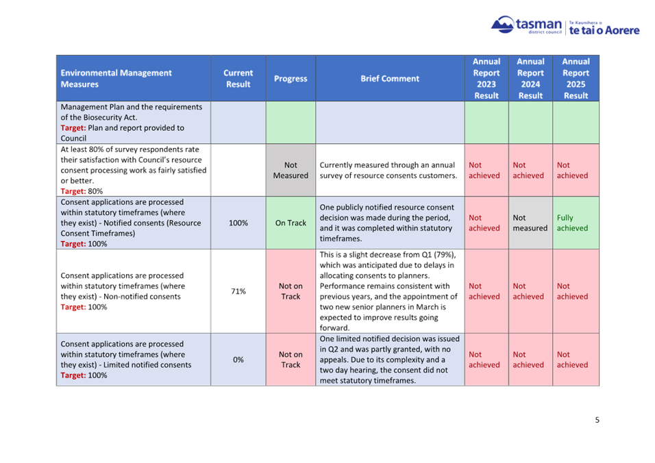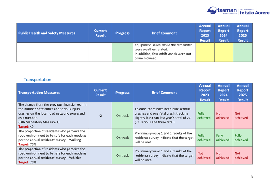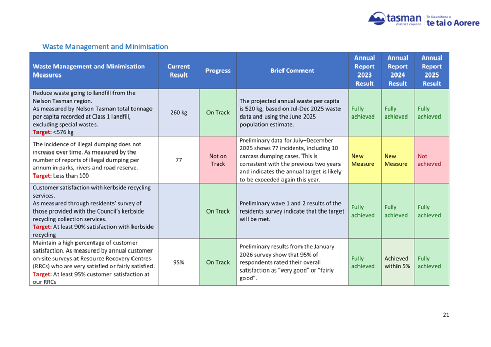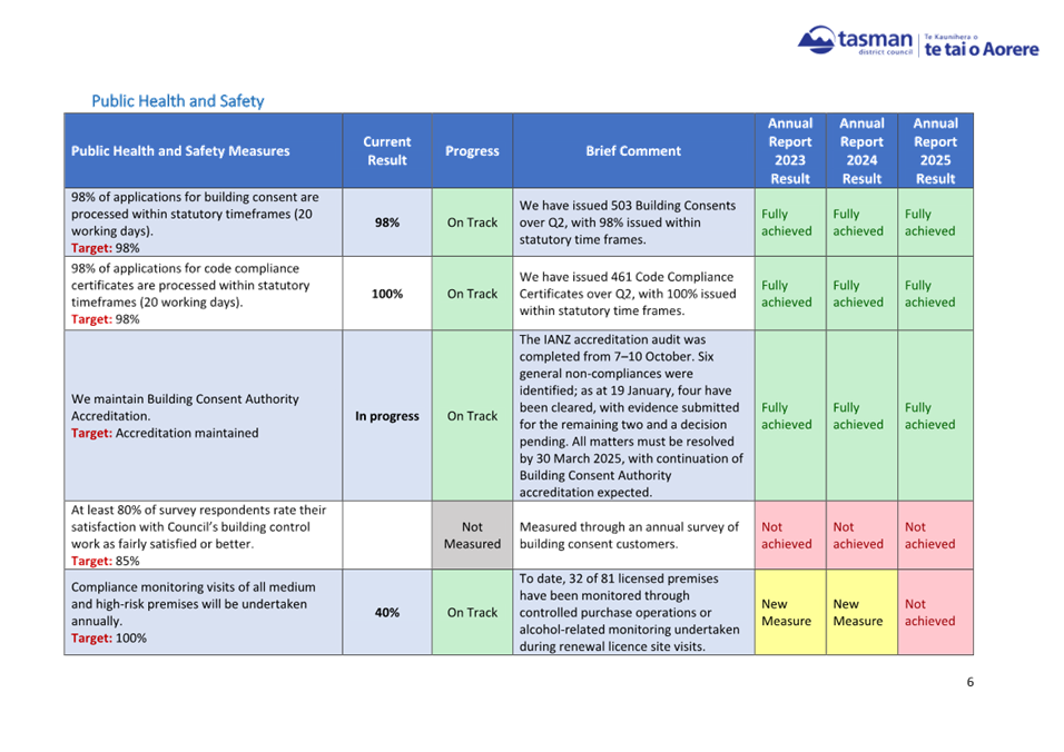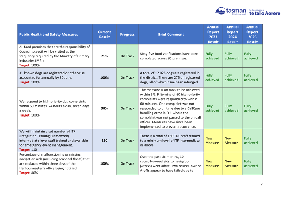 5.1 This report outlines six‑month progress (July–December 2025) against the Levels of Service Performance Measures in Tasman’s 10‑Year Plan 2024–2034.
