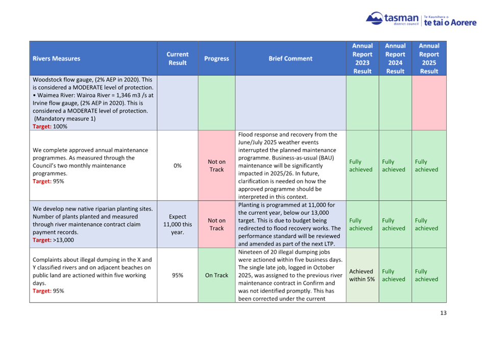 3.5 The 12 measures that are currently not on track are primarily due to weather impacts, resourcing pressures, and regulatory complexity. Staff are monitoring these measures and intervening where possible.