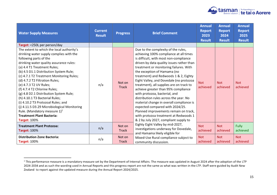 Due to the complexity of the rules, achieving 100% compliance at all times is difficult, with most non‑compliance driven by data quality issues rather than treatment or monitoring failures. With the exception of Hamama (no treatment) and Redwoods 1 & 2, Eighty Eight Valley, and Dovedale (no protozoa treatment), all supplies are on track to achieve greater than 95% compliance with protozoa, bacterial, and distribution rules across the year. No material change in overall compliance is expected compared with 2024/25. Planned improvements remain on track, with protozoa treatment at Redwoods 1 & 2 by July 2027, compliant supply to Eighty Eight Valley by mid‑2027, investigations underway for Dovedale, and Hamama likely eligible for Mixed‑Use Rural compliance subject to community discussion. |